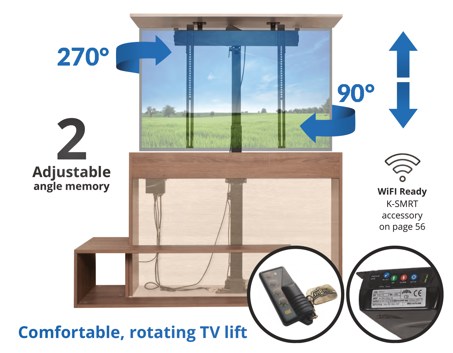 Seria Rotolift oprócz funkcji podnoszenia i opuszczania, może również obracać zamontowany telewizor. Sterowanie radiowe za pomocą pilota RF dostarczanego w zestawie. Obrót 90° zgodnie z ruchem wskazówek zegara i 270° przeciwnie do ruchu wskazówek zegara. Funkcje łagodnego startu i łagodnego zatrzymania zapewniają długą i bezproblemową pracę silnika. Uniwersalny uchwyt do telewizora obejmuje standardy VESA od 100×100 do 600×600. Górną i dolną pozycję oglądania można łatwo zaprogramować, w kilku prostych krokach.