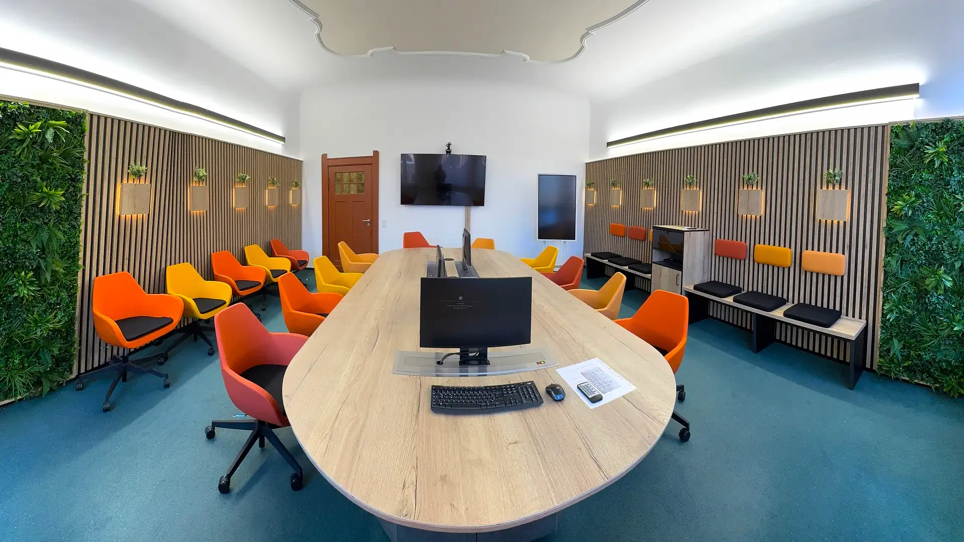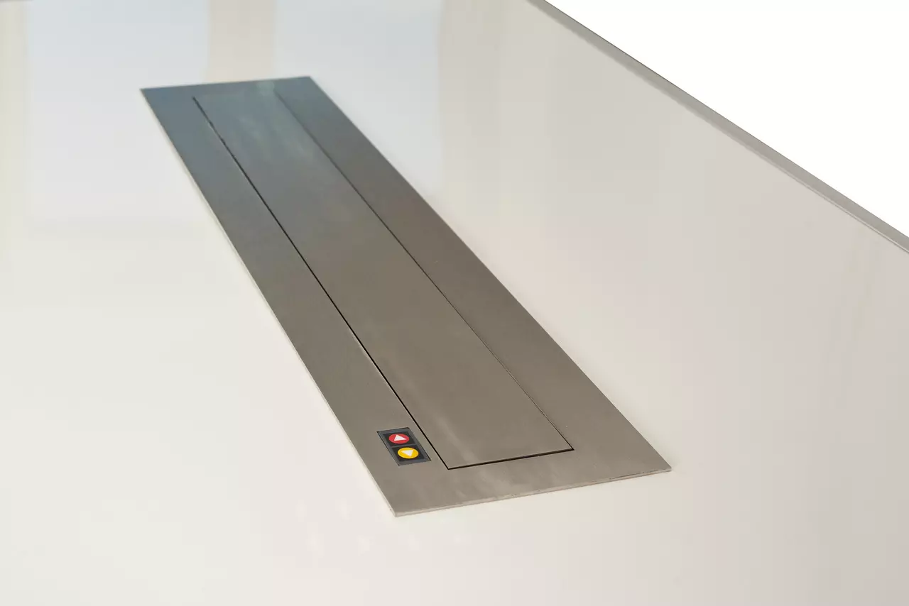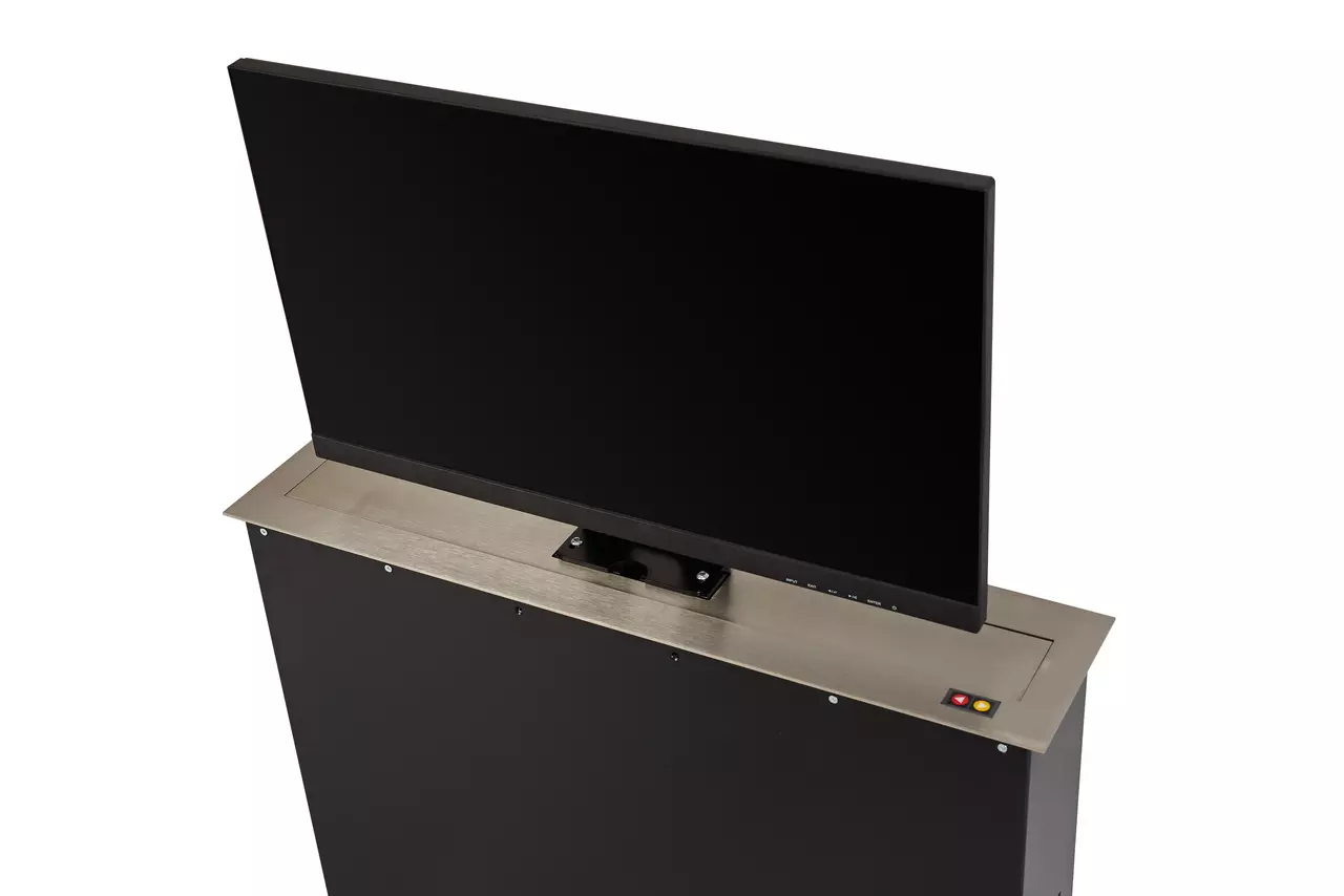 Dzięki temu rozwiązaniu ekran pozostaje ukryty w meblu, zachowując estetykę i funkcjonalność przestrzeni. Idealne do sal konferencyjnych, biur, szkół i nowoczesnych wnętrz domowych.