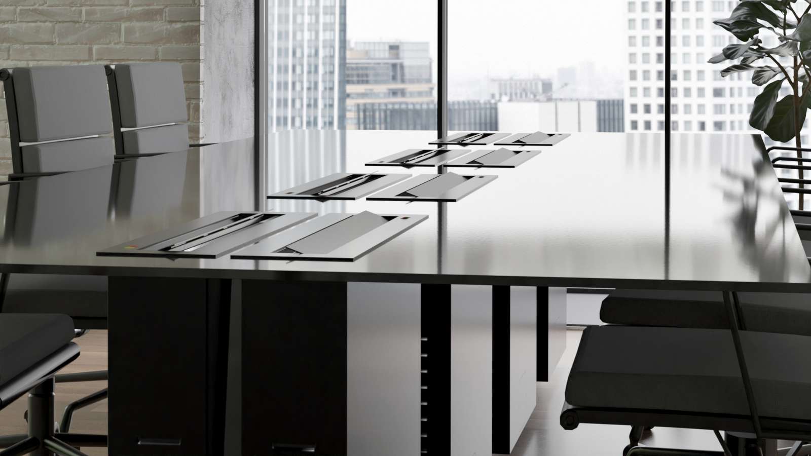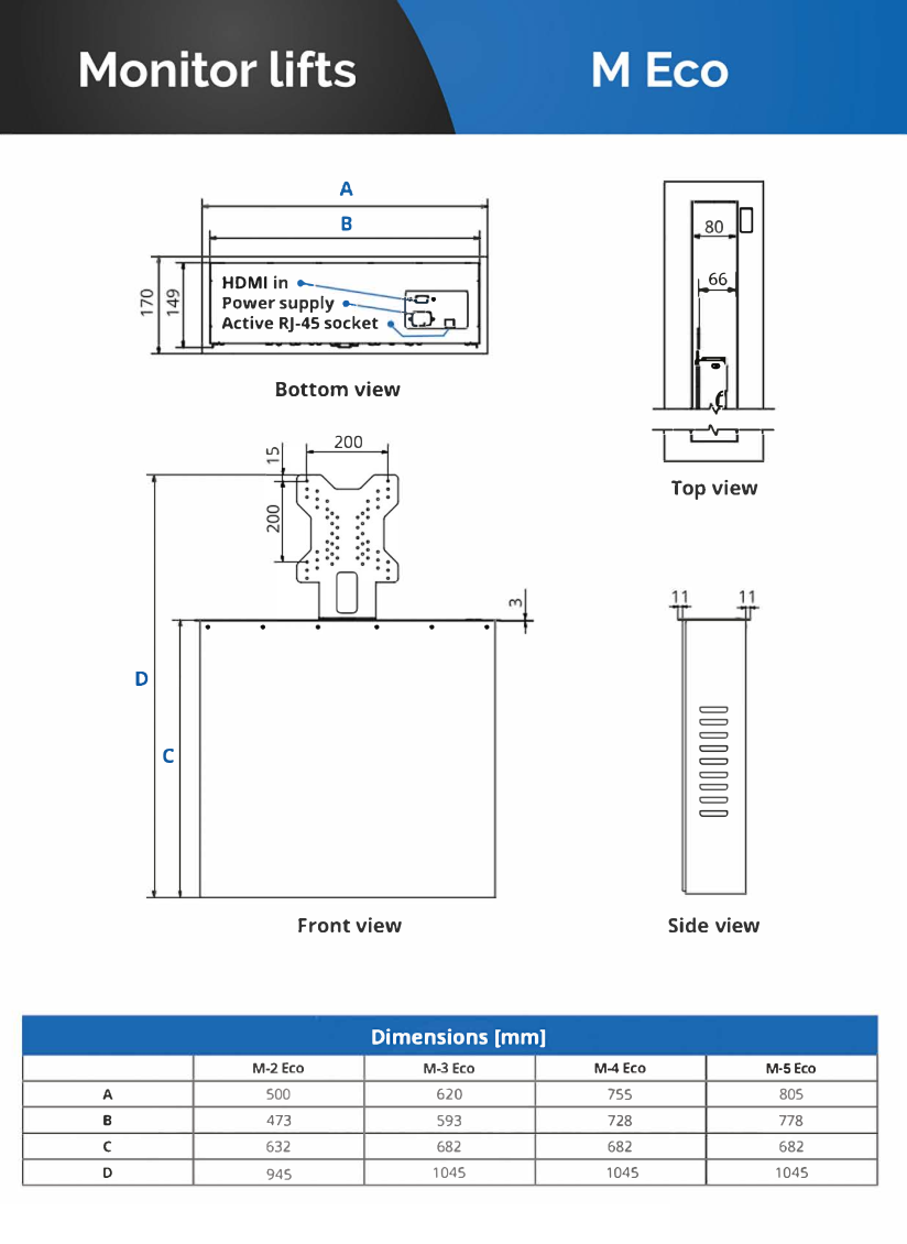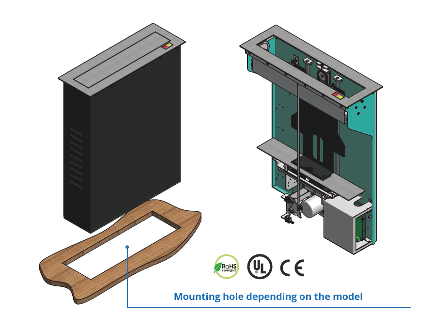 Seria M-ECO to podnośniki kasetowe przeznaczone do zabudowy w blacie i korpusie mebla, umożliwiające automatyczne unoszenie i chowanie monitora, gdy nie jest używany.
