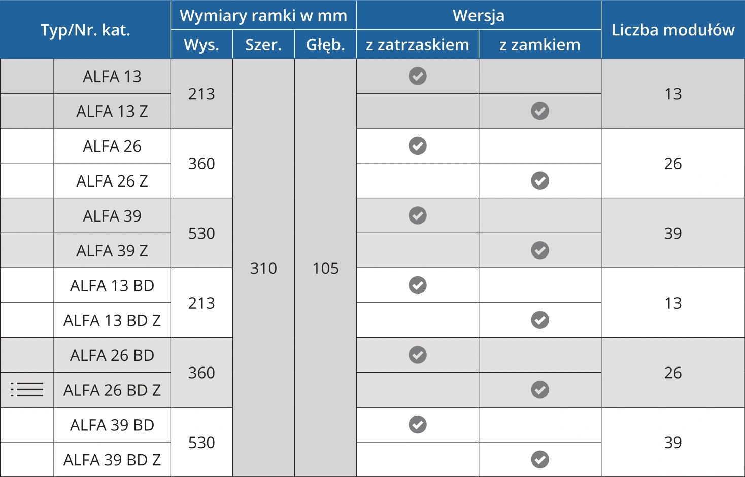 Rozdzielnice elektryczne niskiego napięcia typu ALFA modułowe wykonane z wysokiej jakości niepalnych modyfikowanych tworzyw sztucznych. Konstrukcja tych rozdzielnic umożliwia instalowanie w ich wnętrzu wszelkich modułowych aparatów elektrycznych przystosowanych do montażu na szynach nośnych TH35
