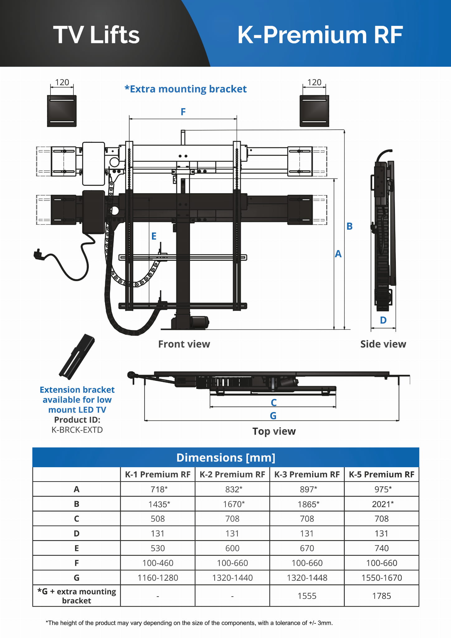 Podnośnik elektryczny do telewizora K-3 PREMIUM C WINDA TV Pilot RF Maksymalna waga telewizora 50kg Maksymalna przekątna ekranu 65"