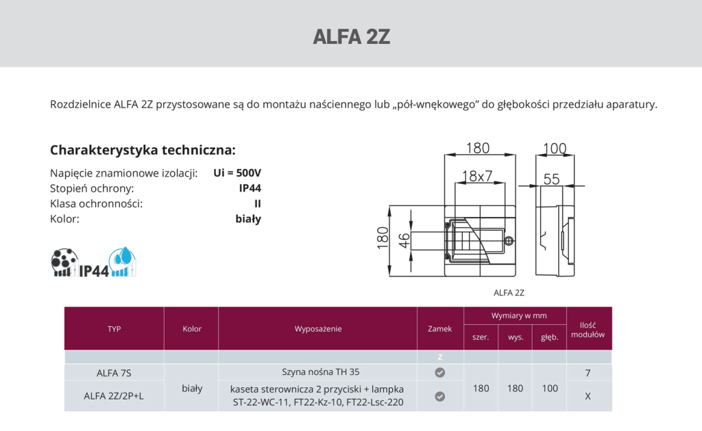 Zastosowanie: konstrukcja rozdzielnic typu ALFA umożliwiainstalowanie w ich wnętrzu wyłączników różnicowoprądowych,wyłączników instalacyjnych oraz wszelkich modułowych aparatów elektrycznych przystosowanych do montażu na szynach montażowych TH 35.