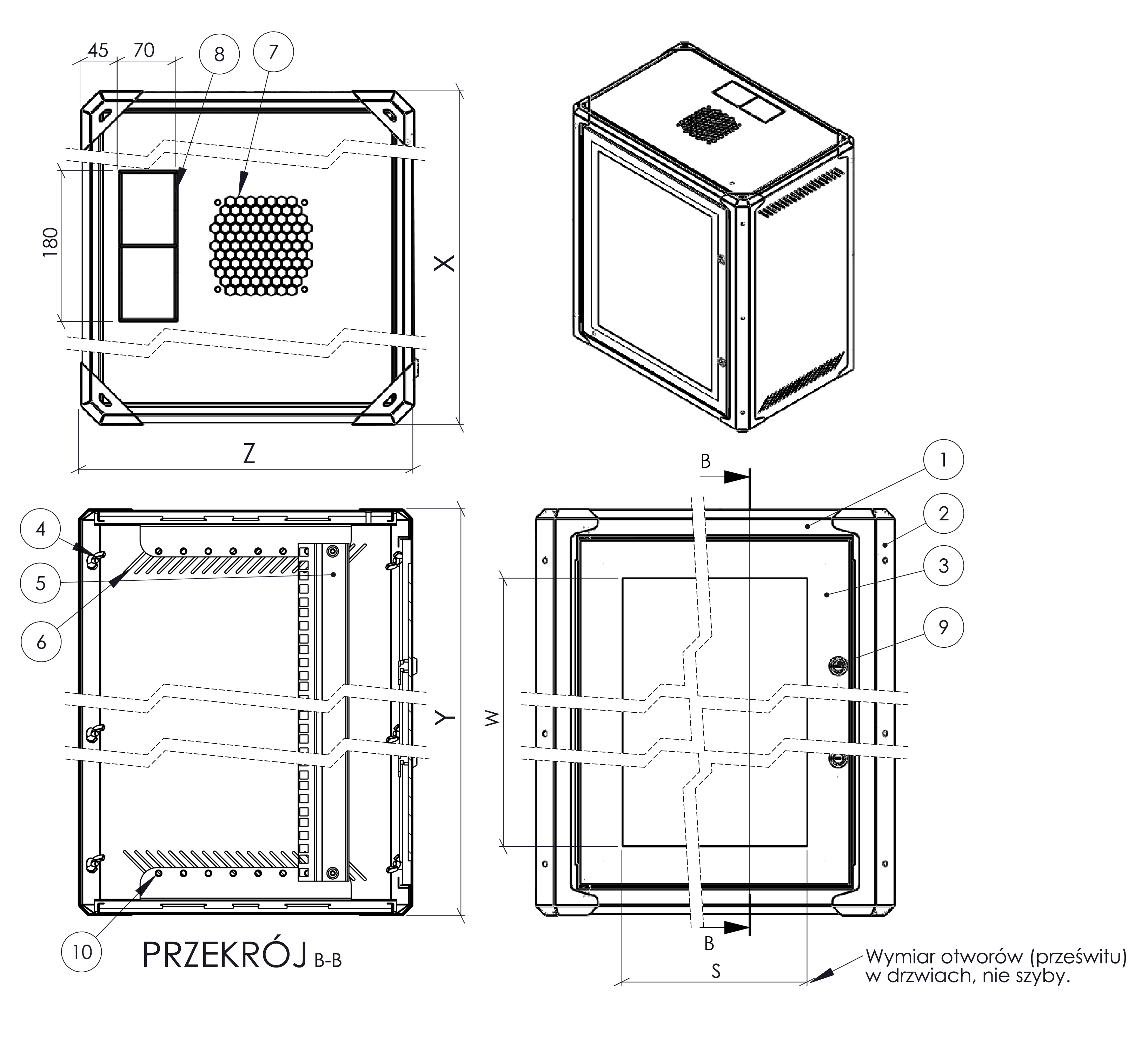 - Wymiary – Standard 19", wysokość 9U, głębokość i szerokość 600x600 mm.