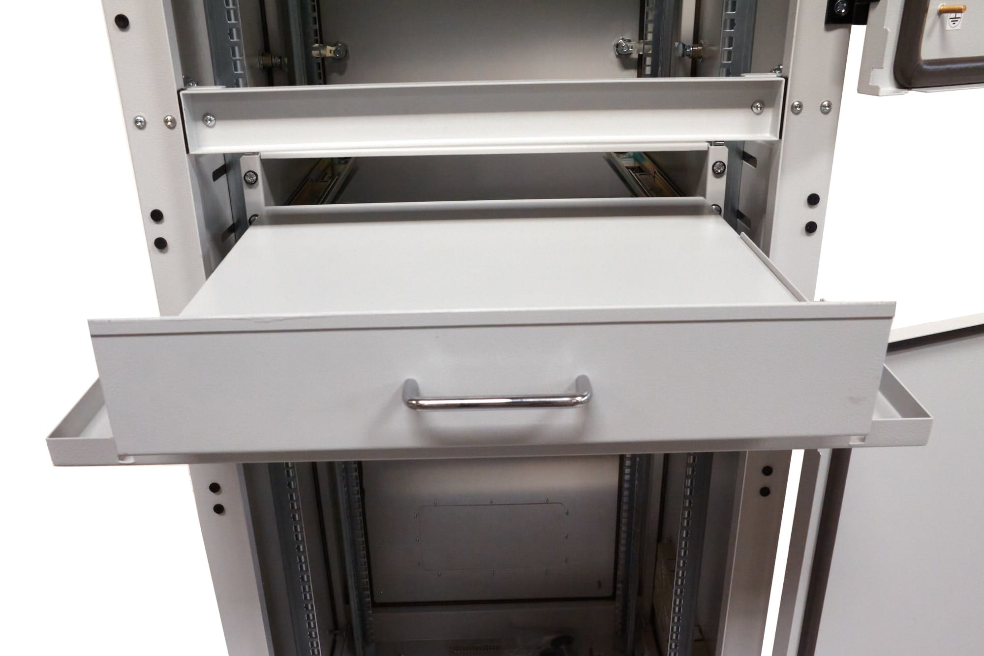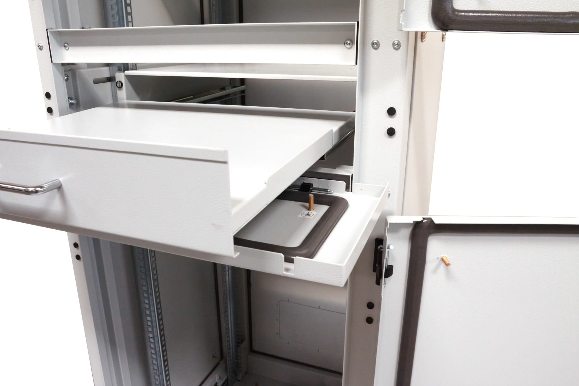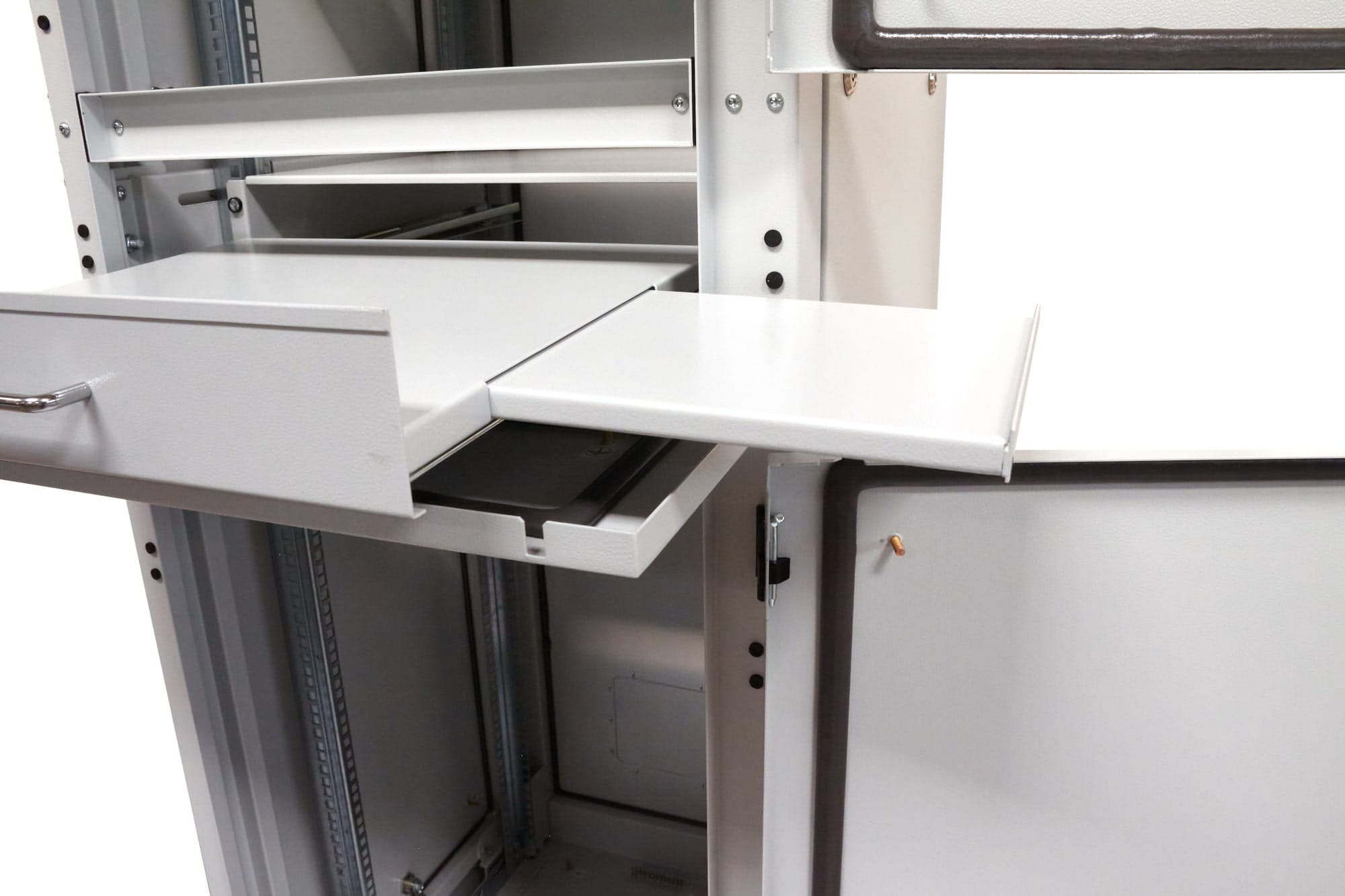 Półka 1U wykonana w standardzie rack 19" -mocowanie 4-punktowe, o głębokości 600 mm, regulowana głębokość montażowa o dodatkowe 200 mm (maksymalny rozstaw belek rack 450 mm), nośność 50 kg. Półka wyposażona w solidne prowadnice, które pozwalają na stabilne wysunięcie półki nawet z dużym obciążeniem. Uniwersalna półka do szaf rack jest kompatybilna ze wszystkimi szafami sterowniczymi w standardzie 19 cali dowolnego producenta na rynku.