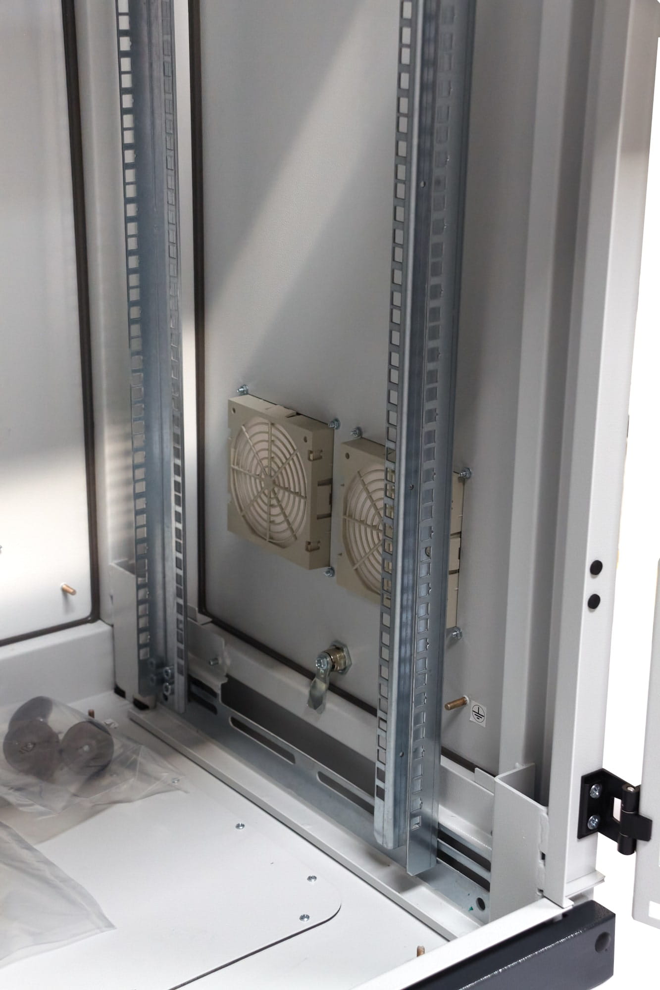 Panel wentylacyjny ze standardowymi uchwytami do mocowania na szynach 19". Panele wentylacyjne pasują do wszystkich produkowanych przez nas szaf o odpowiednich wymiarach.
