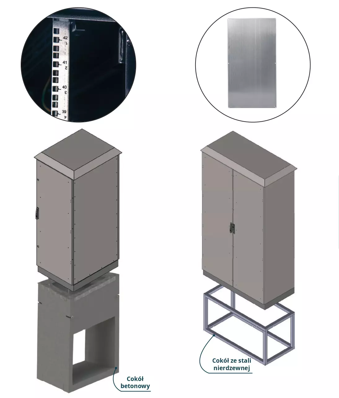 - Estetyka i personalizacja: standardowy kolor RAL 7035 z opcją innych kolorów na zamówienie, idealne dla każdej szafy zewnętrznej teleinformatycznej.