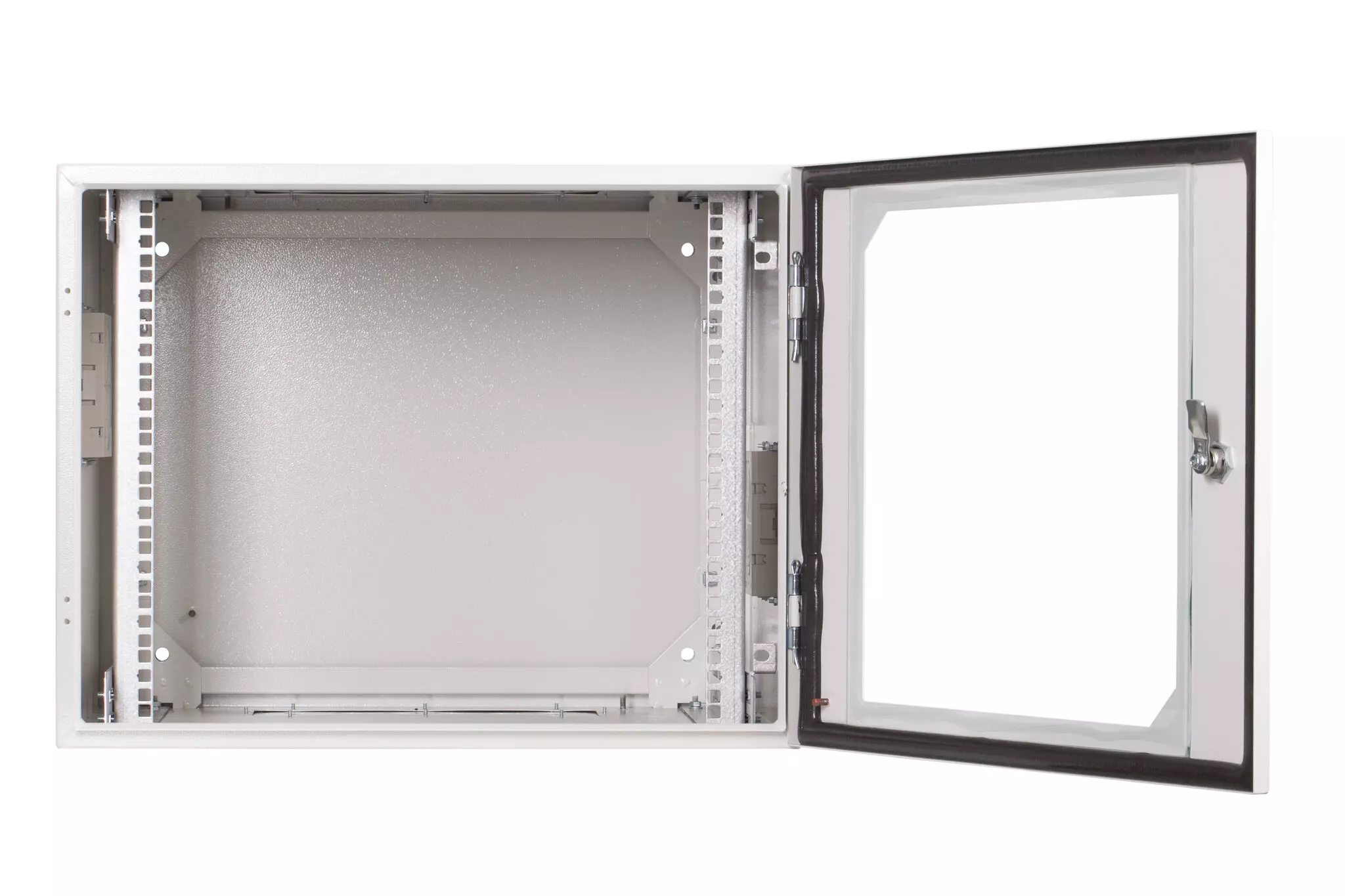 Szafa wisząca rack 19″ dwuczęściowa 12U 600x600 IP54 Ściany boczne pełne Drzwi z szybą Wewnętrzna RAL 7035 szary SWKD19-12U-60-DS-W