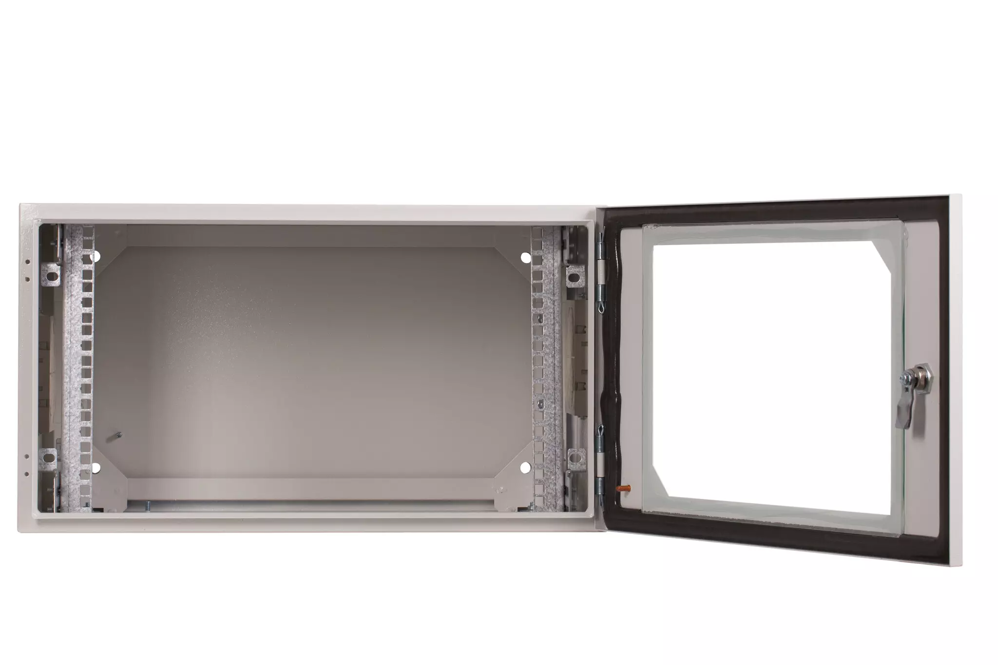 Szafa wisząca rack 19″ dwuczęściowa 12U 600x600 IP54 Ściany boczne pełne Drzwi z szybą Wewnętrzna RAL 7035 szary SWKD19-12U-60-DS-W