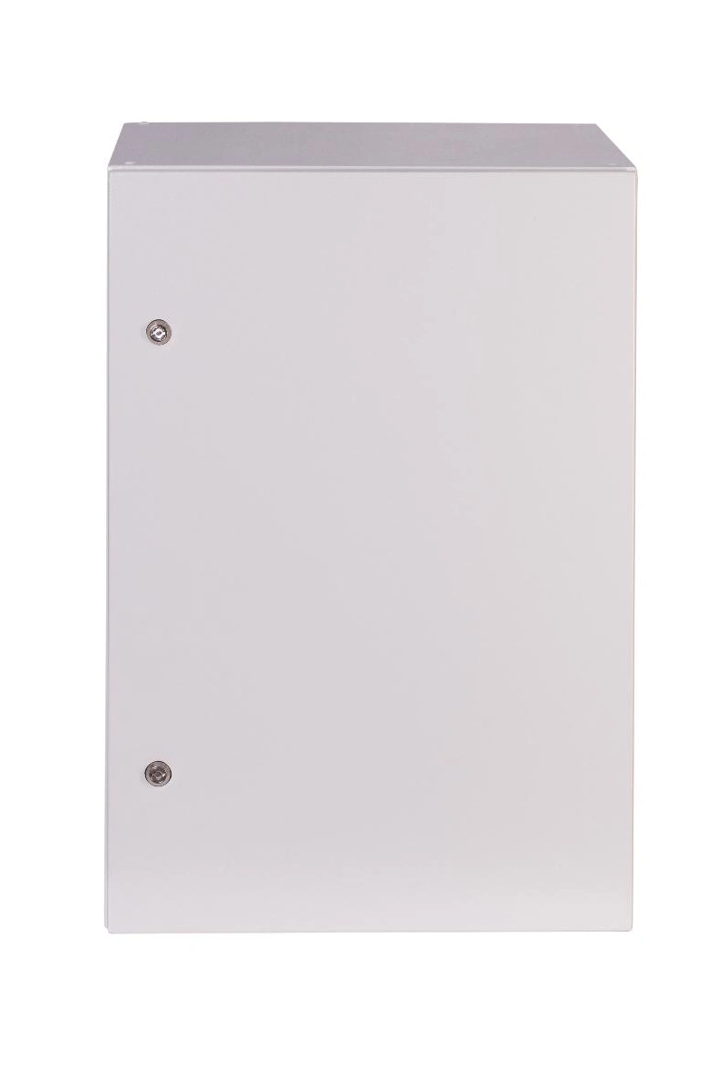Obudowa wykonana została z stali nierdzewnej AISI 304, malowanej proszkowo na kolor RAL 7035, co zapewnia wysoką odporność na korozję oraz trwałość w warunkach zewnętrznych. Drzwi wyposażono w poliuretanową uszczelkę odporną na promienie UV, a konstrukcja spełnia normę szczelności IP54, skutecznie chroniąc sprzęt przed kurzem, wilgocią oraz wpływem czynników atmosferycznych.