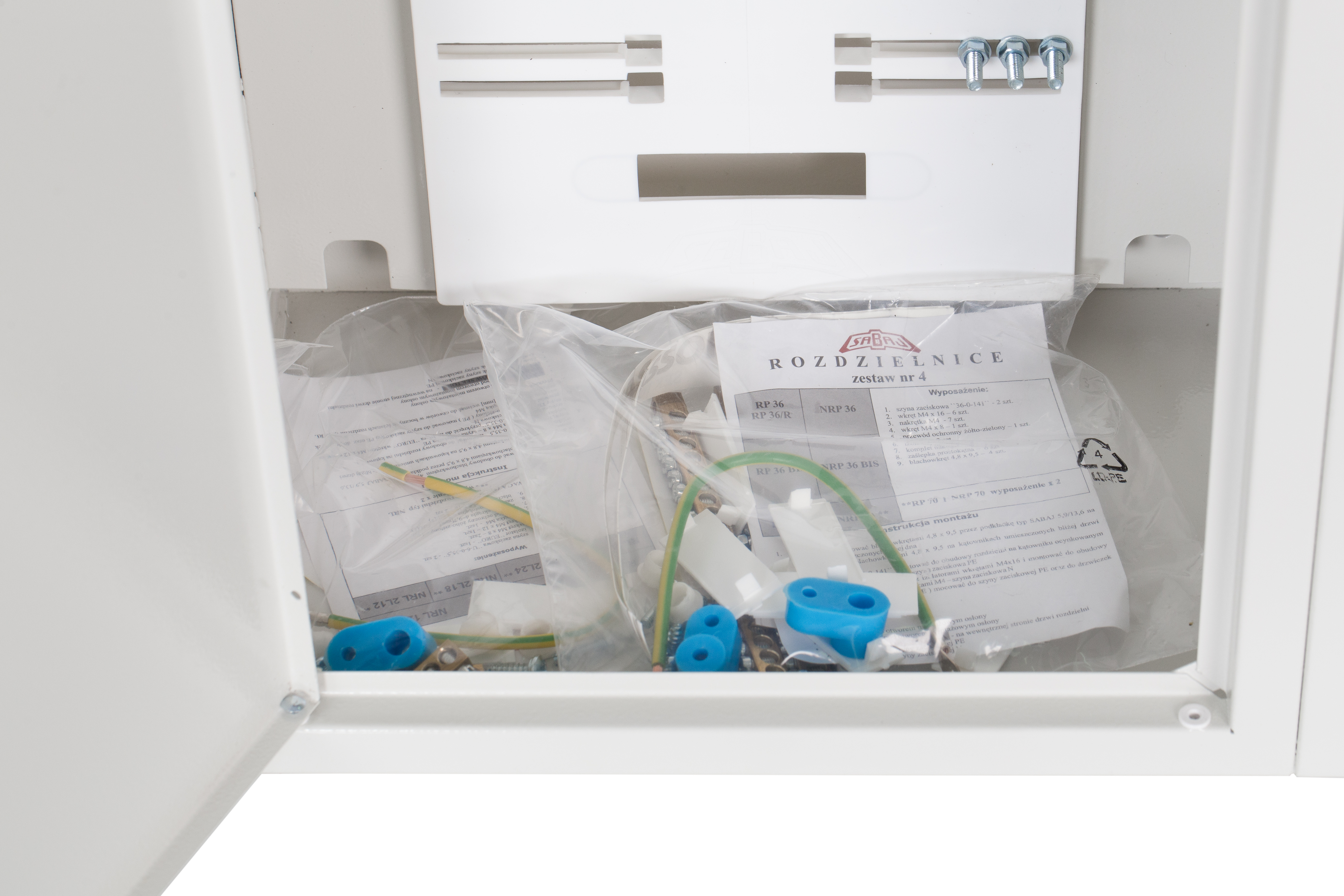 Tablica pod licznik, szyna TH 35, szyny zaciskowe, izolator, zestaw wkrętów i nakrętek, przewód ochronny żółto-zielony, zestaw naklejek, zaślepki plastikowe prostokątne i okrągłe.