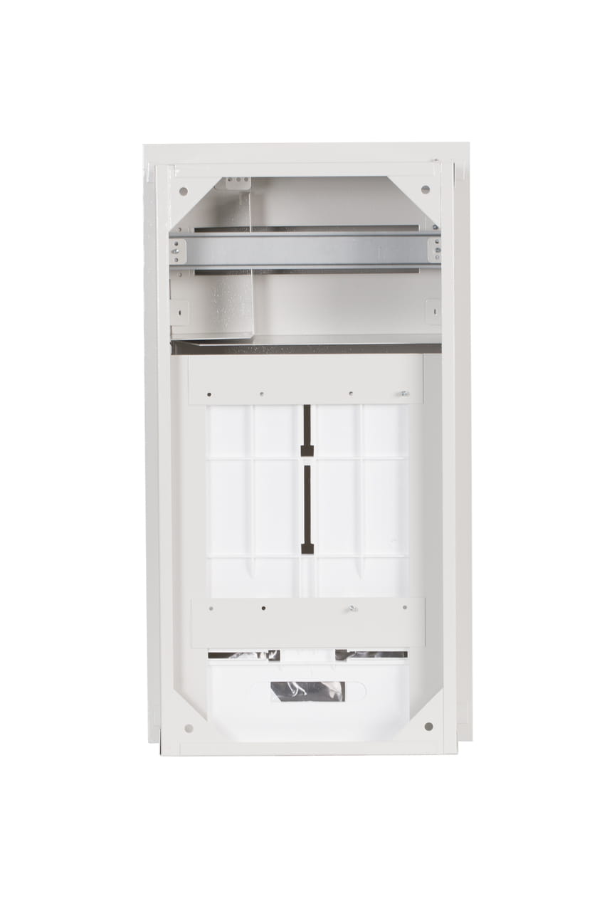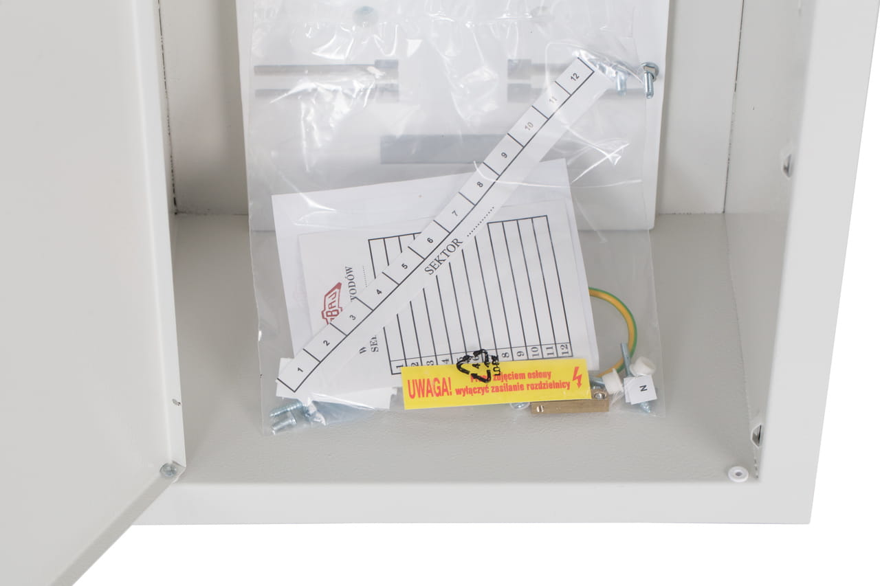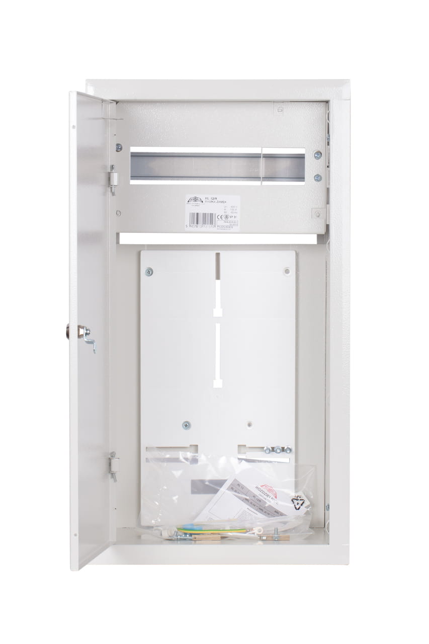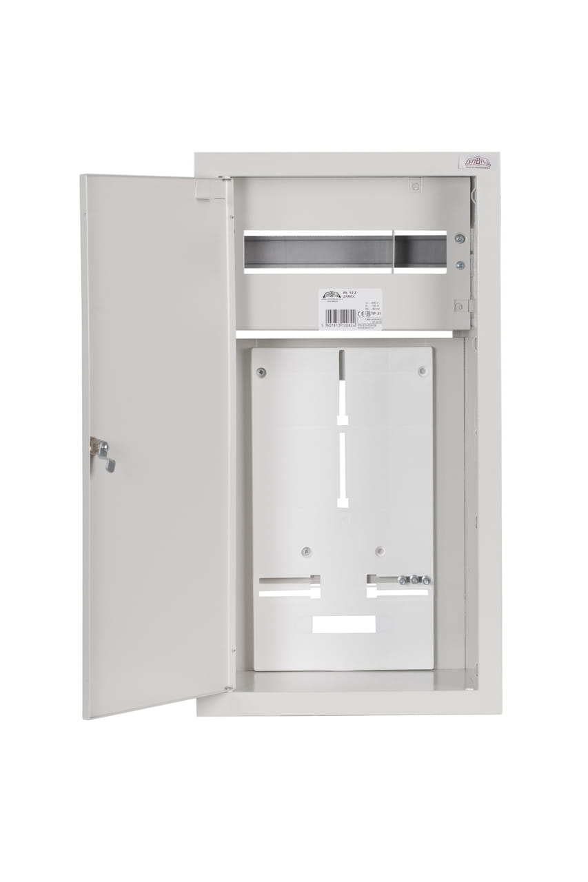 - Metalowa podtynkowa rozdzielnica typu RL, przeznaczona do zainstalowania 3-fazowego elektronicznego licznika oraz 12 zabezpieczeń