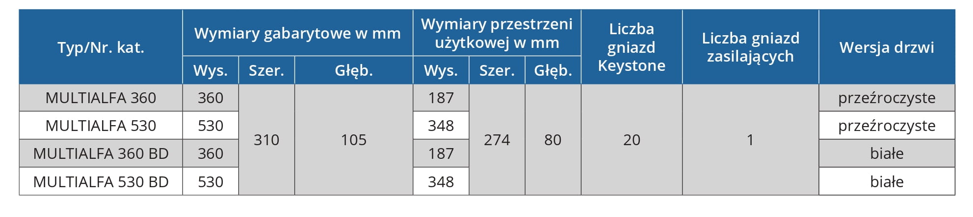 Rozdzielnia Multi-Alfa jest idealnym rozwiązaniem jako centrum instalacji telewizji naziemnej, satelitarnej czy CCTV (telewizja przemysłowa) oraz sieci telefonicznej, LAN lub światłowodowej. Multi-Alfa ze swoją plastikową konstrukcją wyróżnia się prostotą budowy, lekkością, dużą przestrzenią montażową, przy zachowaniu wysokiej jakości produktu. Skrzynka zgodna z rozporządzeniem Ministra Transportu, Budownictwa i Gospodarki Morskiej z 06.11.2012 odnośnie telekomunikacyjnych skrzynek mieszkaniowych.